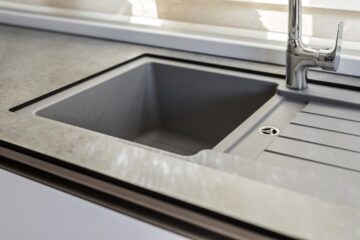 Bílá kuchyňská linka v provedení vysoký lesk, kombinovaná s mořenou dubovou dýhou…
